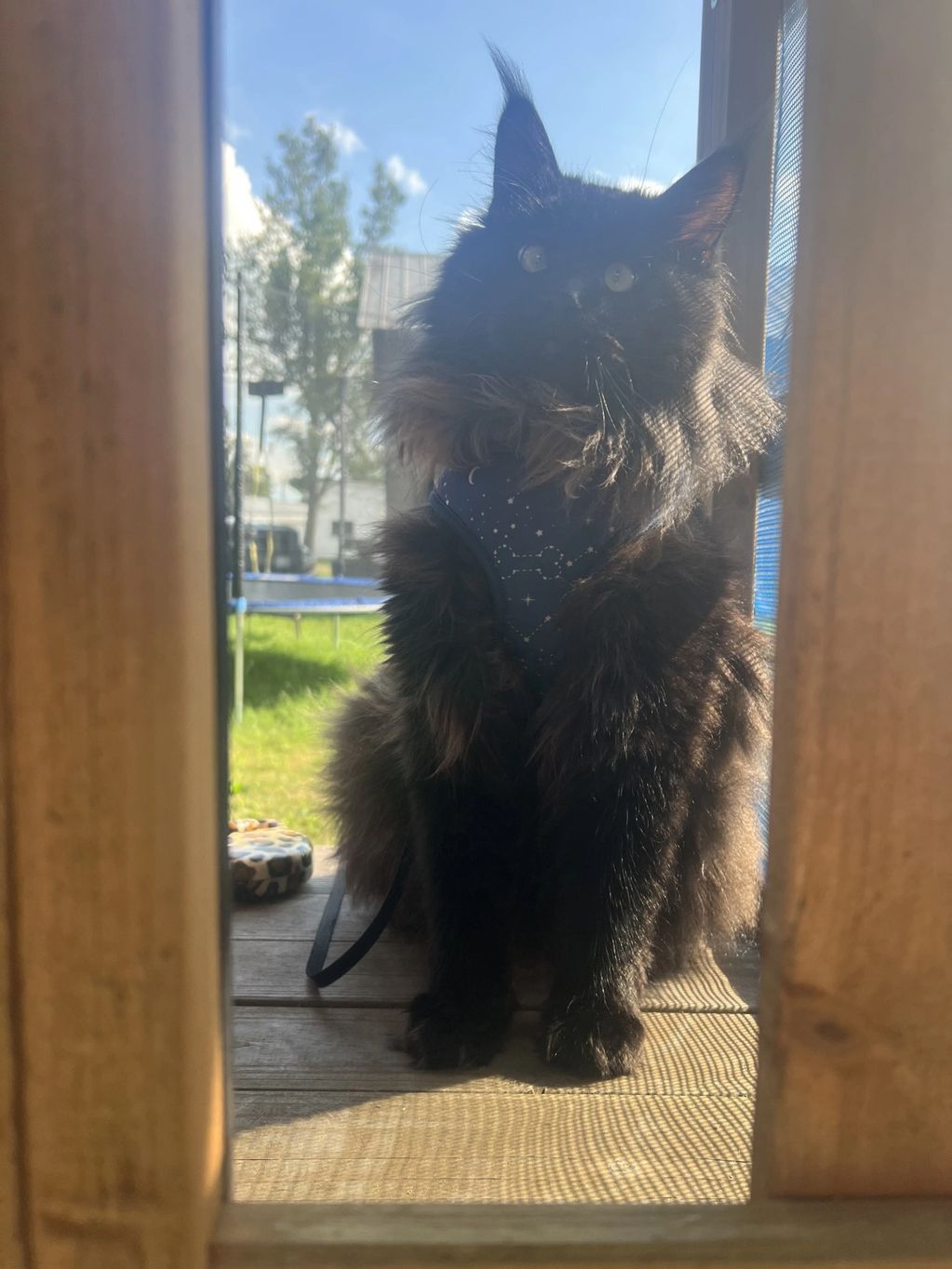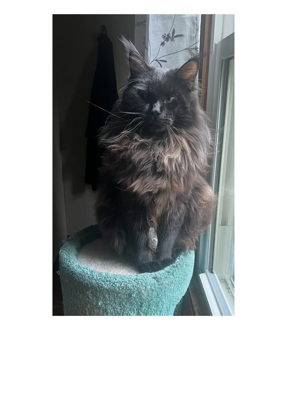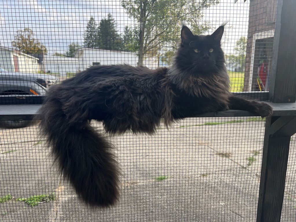 When he is relaxing in the catio, he loves the wind in his fur and to watch the wildlife in the backyard